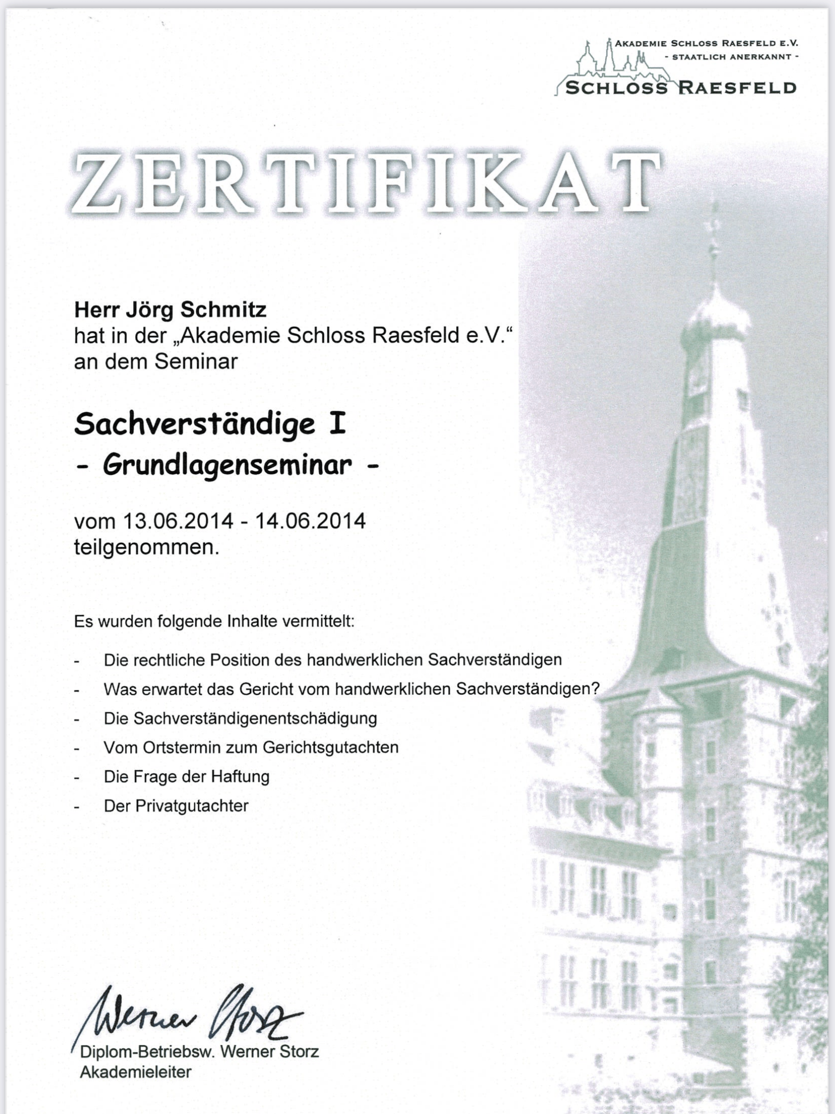 - Seminar Sachverständiger des Handwerks I+II auf Schloss Raesfeld mit Prüfung